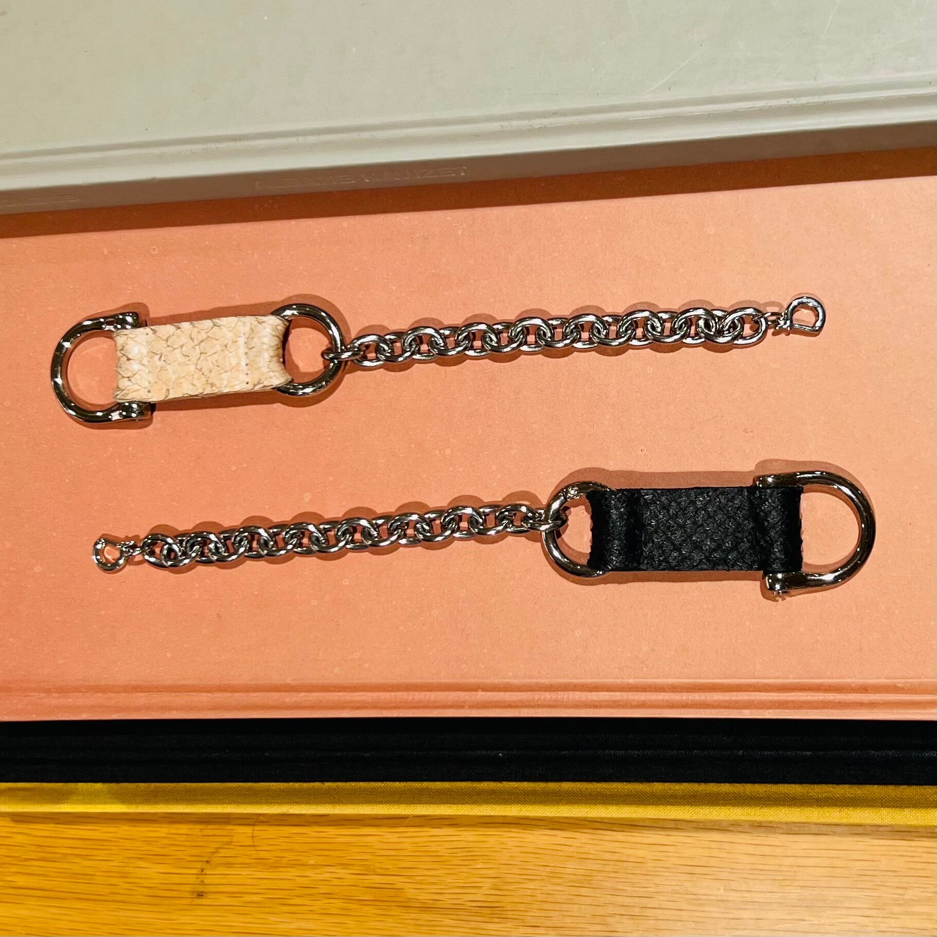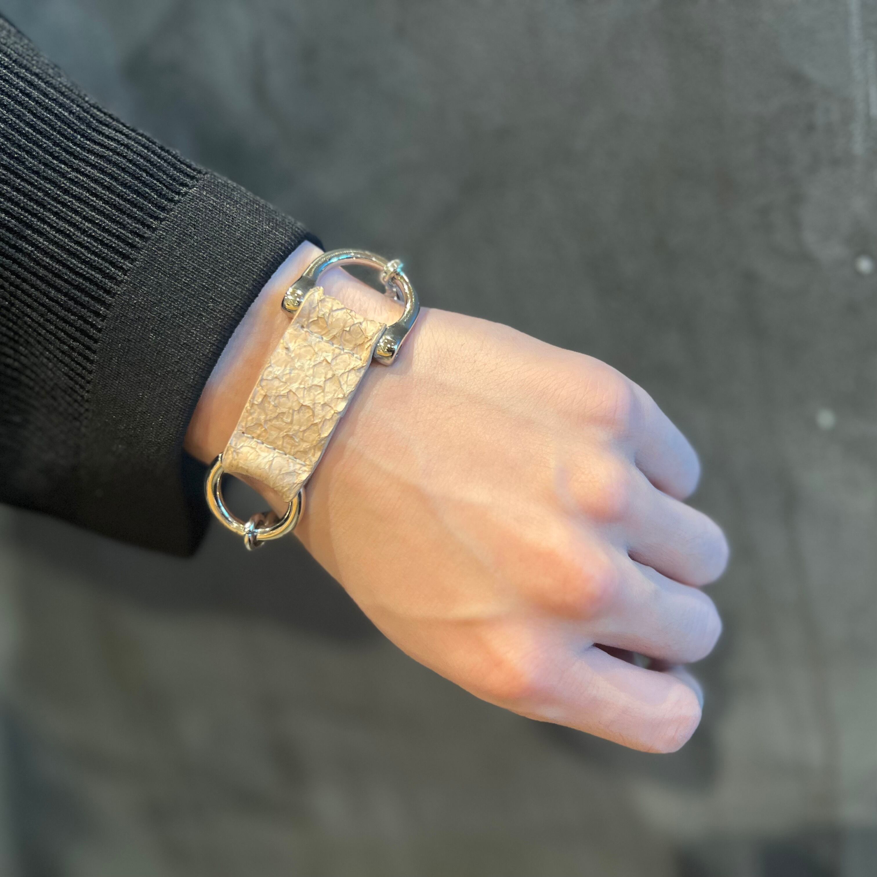 通常は廃棄されてしまう魚の革を職人が丁寧になめし処理をほどこし、そのレザー素材をベルト部に使用したサステナブルなチェーンブレスレット。