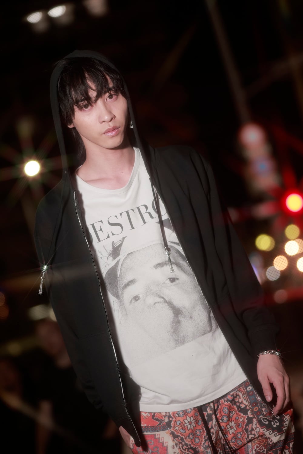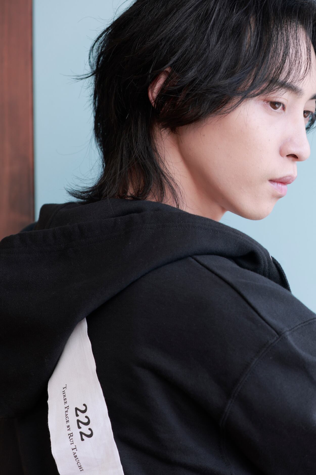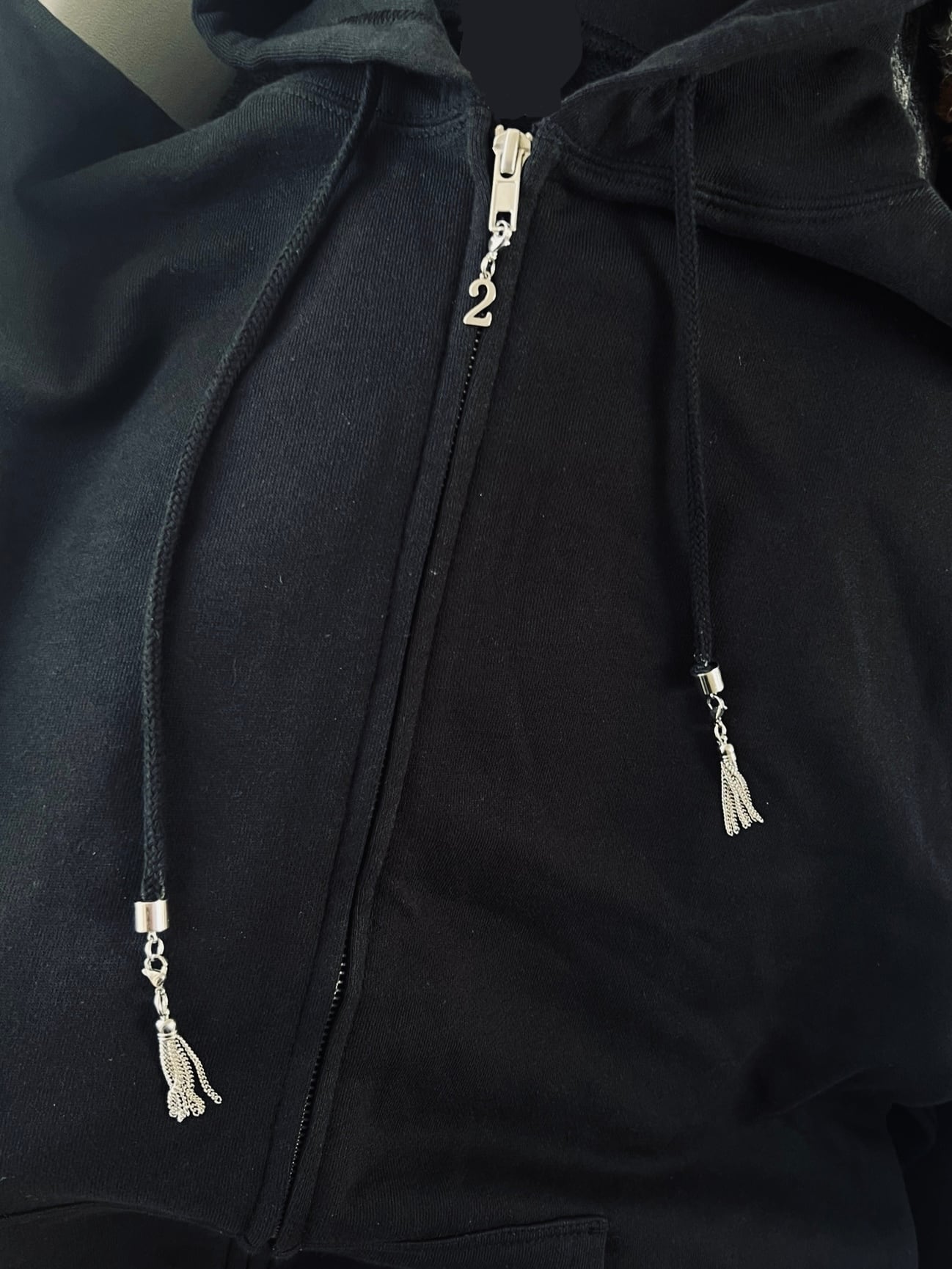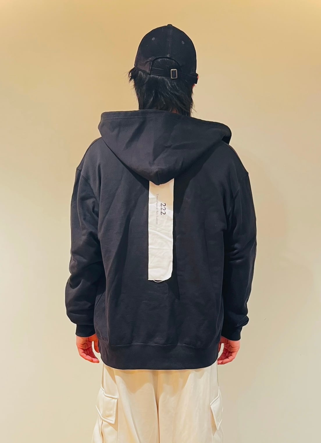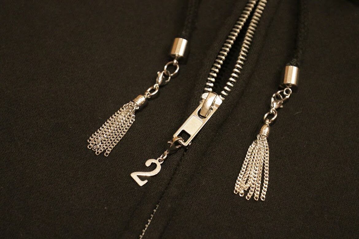 背中に222のブランドロングタグとフード紐の先には取り外し可能な222オリジナルタッセルチャームとファスナーには222の「2」チャームが可愛く揺れる仕様になっています。