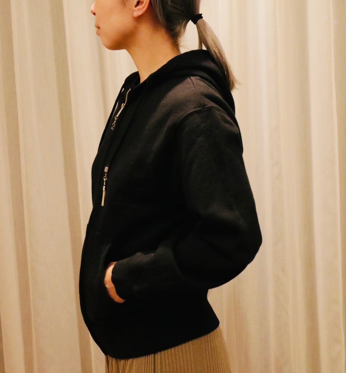 オールシーズン着用可能なパイル素材のフードパーカー